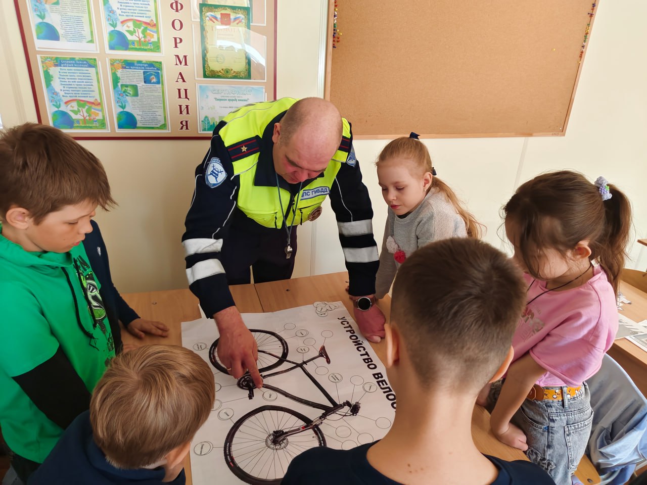 На станции «Устройство велосипеда» дети вместе с инспектором изучали конструкцию двухколесного транспорта, разбирая назначение каждой детали для безопасной езды.