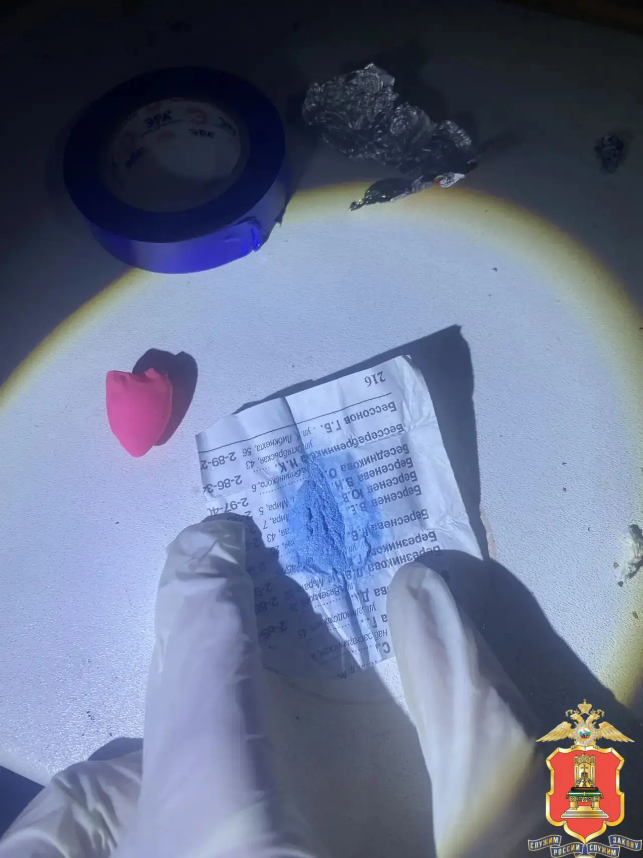 В ходе обыска у подозреваемой полицейские обнаружили и изъяли электронные весы с наслоением наркотика, порошкообразное вещество синего цвета в свёртке из фольги, зип-пакет со светлым порошком, зип-пакеты с остатками вещества. Находки направлены на исследование в региональный ЭКЦ.