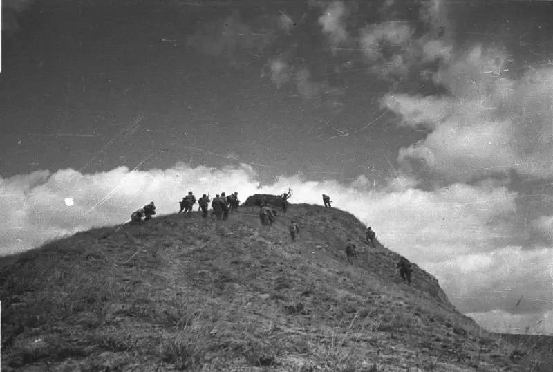 А на высотах - почти не пострадавшие от артподготовки и воздушного удара немецкие траншеи, доты, дзоты, вкопанные в землю по башню танки, поставленные на прямую наводку 88-мм зенитки...