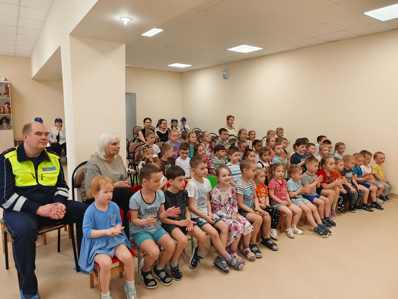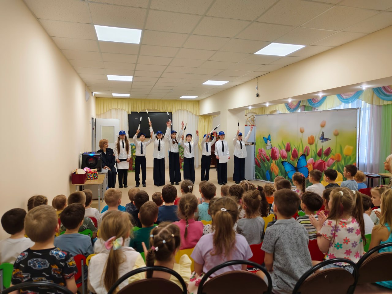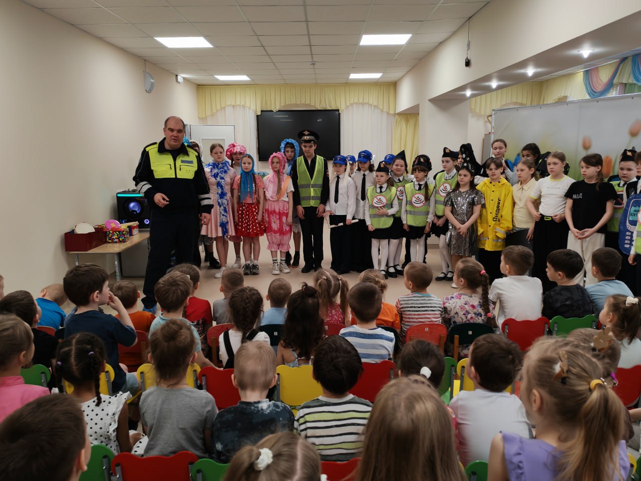 К малышам пришли «гости в погонах» — сотрудники городской Госавтоинспекции — и юные артисты из агитбригады СОШ № 34 города Твери. Главная цель встречи — в доступной и игровой форме объяснить дошкольникам, почему дорога не прощает ошибок и как стать «заметным» пешеходом.