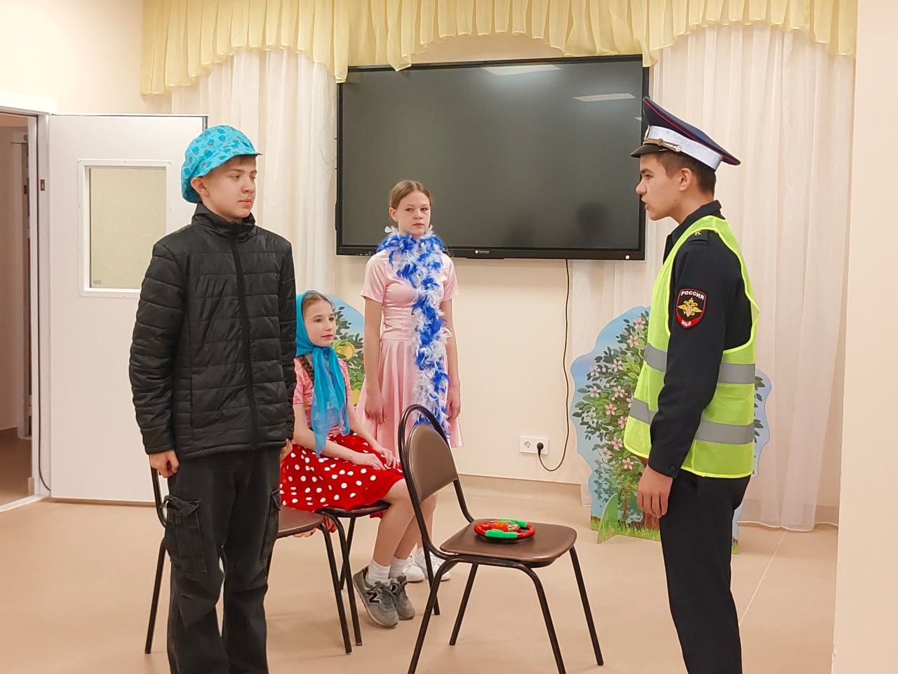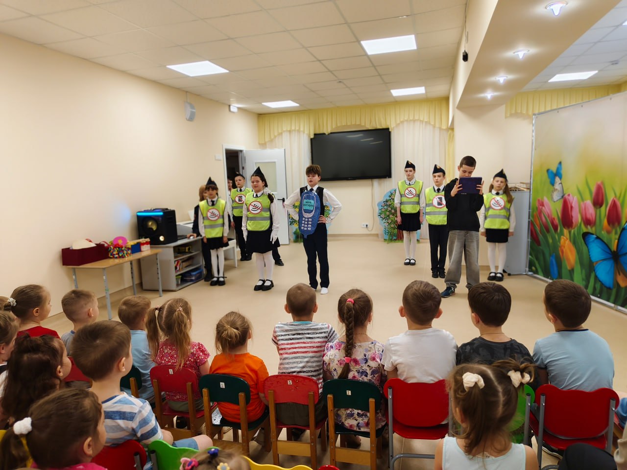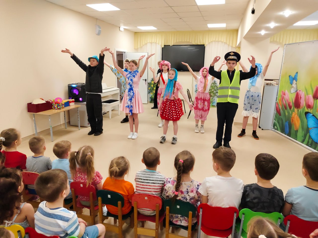 К малышам пришли «гости в погонах» — сотрудники городской Госавтоинспекции — и юные артисты из агитбригады СОШ № 34 города Твери. Главная цель встречи — в доступной и игровой форме объяснить дошкольникам, почему дорога не прощает ошибок и как стать «заметным» пешеходом.