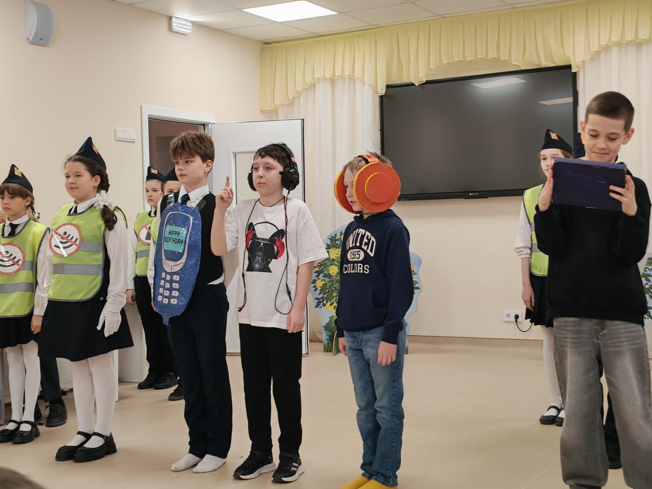 «Гаджет — друг или враг?» — с помощью оригинальных костюмов (огромных наушников и мобильного телефона) школьники показали, как опасно отвлекаться на игры и музыку вблизи проезжей части.
