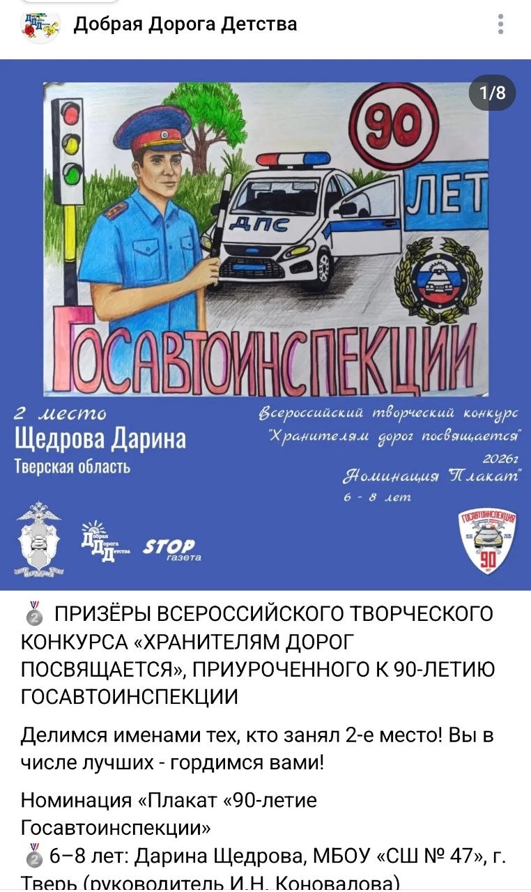 С гордостью сообщаем, что по результатам экспертной оценки жюри почетное место в номинации «Плакат «90-летие Госавтоинспекции» заняла жительница Твери — ученица МБОУ СШ № 47 Дарина Щедрова.