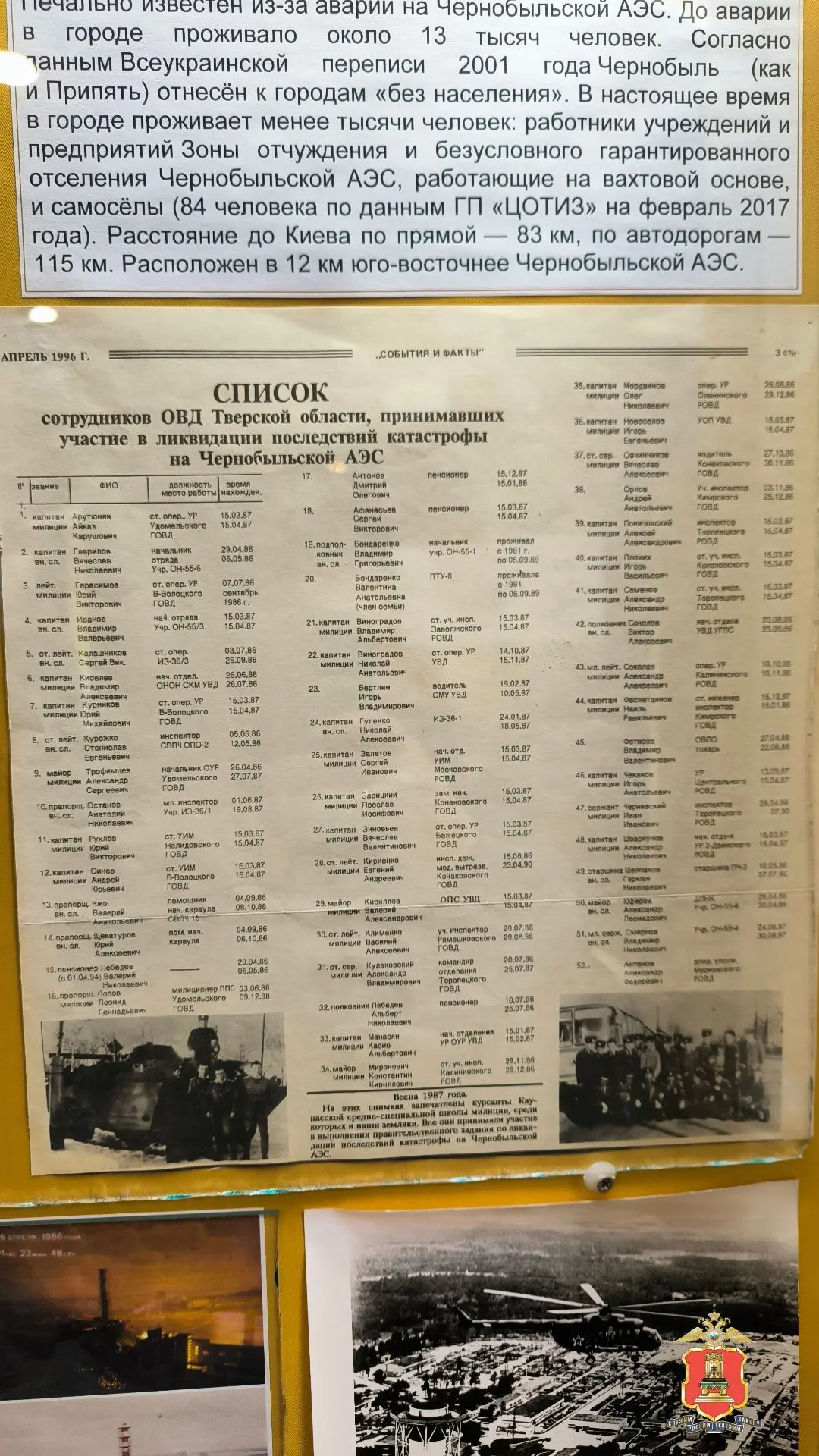 Мужеству, героизму и самоотверженности солдат правопорядка посвящён раздел в музейной экспозиции УМВД России по Тверской области. На стендах фотографии, справки, вырезки из газетных статей и имена 52 сотрудников. Среди них – участковые инспекторы милиции, оперуполномоченные уголовного розыска, водители, дежурные медвытрезвителя, помощники начальника караула СВПЧ, сотрудники вневедомственной охраны и патрульно-постовой службы, руководители районных подразделений. Областной центр, Вышний Волочек, Удомля, Торопец, Нелидово, Конаково, Бежецк, Кимры, Рамешки, Оленино, Западная Двина – сотрудники ОВД со всех уголков нашей области встали на борьбу с атомной смертью.