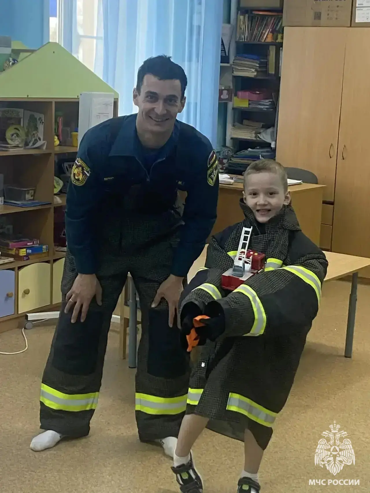 Особый интерес вызвала практическая часть: дети смогли примерить настоящую боевую одежду пожарного, надеть каску и почувствовать себя настоящими спасателями.