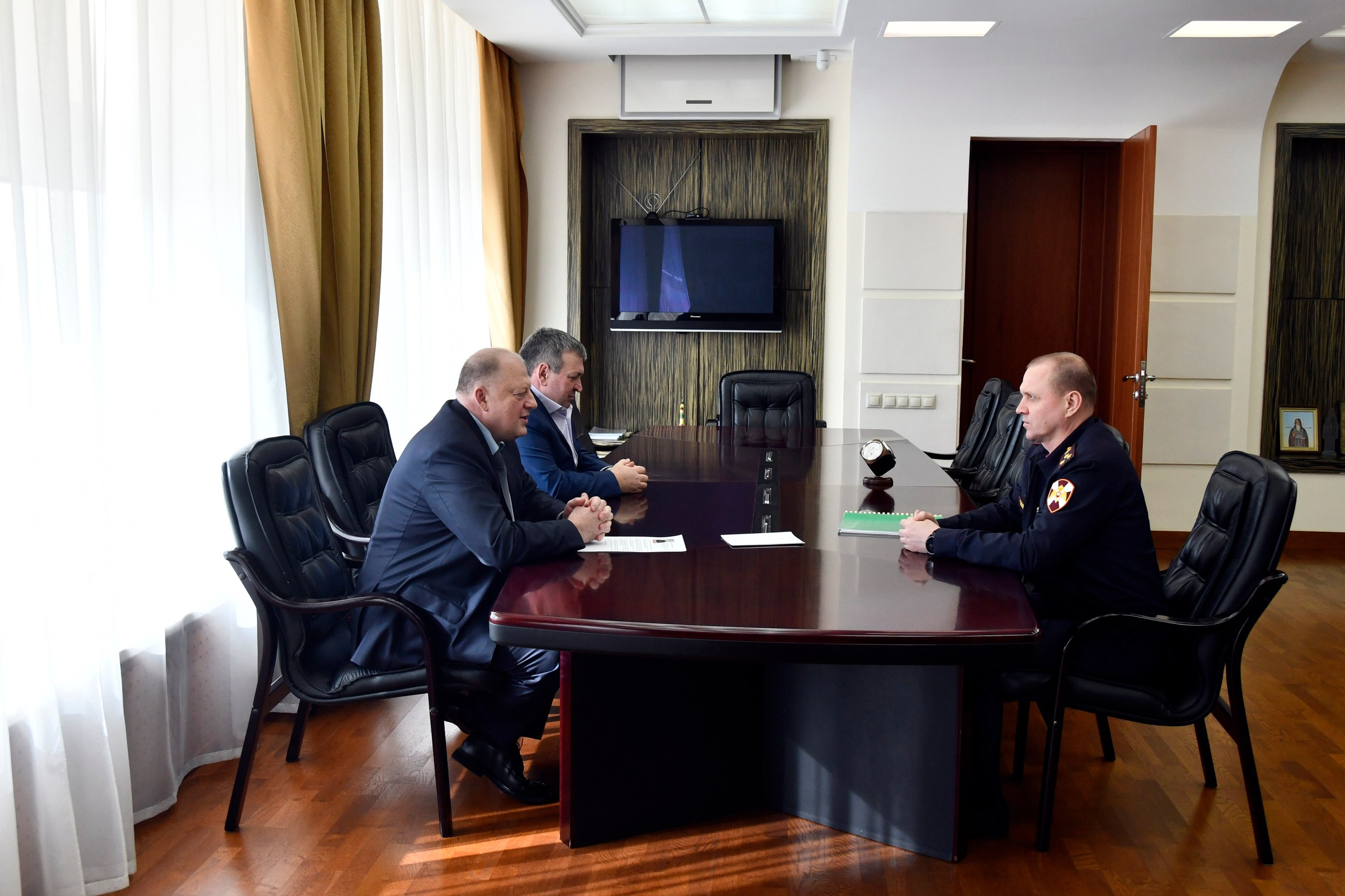 Председатель ЗСТО Сергей Голубев и его заместитель Александр Клиновский провели рабочую встречу с начальником Управления Федеральной службы войск национальной гвардии РФ по Тверской области полковником полиции Дмитрием Сурковым.
