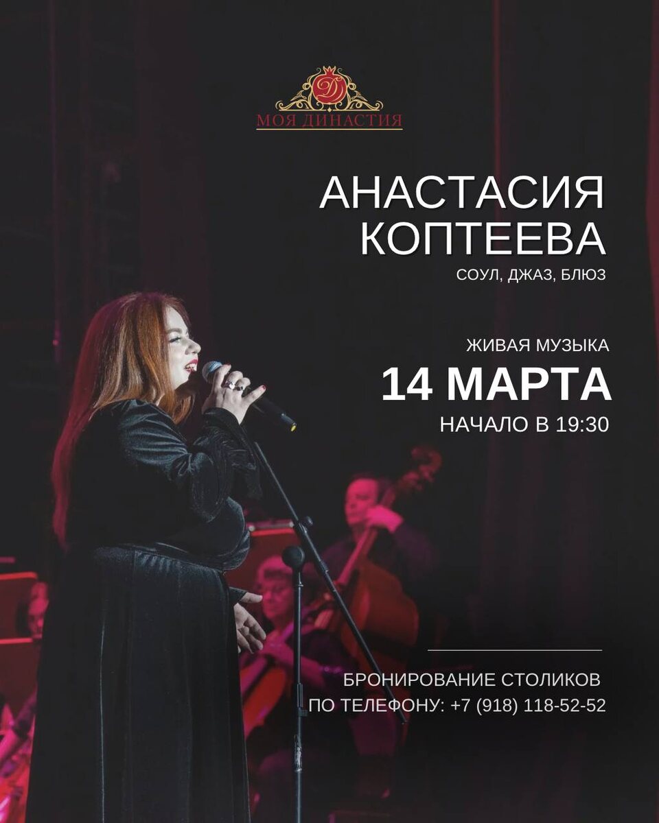 14 марта в 19:30 в ресторане отеля «Династия» состоится уникальное музыкальное событие. Гостей ждёт вечер, наполненный живыми мелодиями от талантливой вокалистки Анастасии Коптеевой, исполненной в стилях соул, джаз и блюз.
