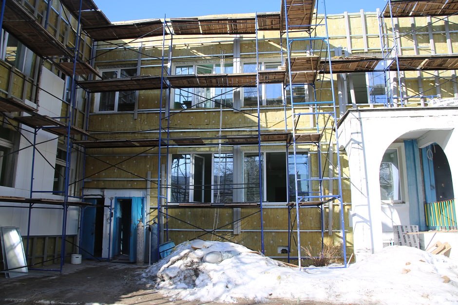 В марте в школе №16 города Твери полным ходом идет капитальный ремонт: здание в строительных лесах, в классах и рекреациях - стройматериалы.