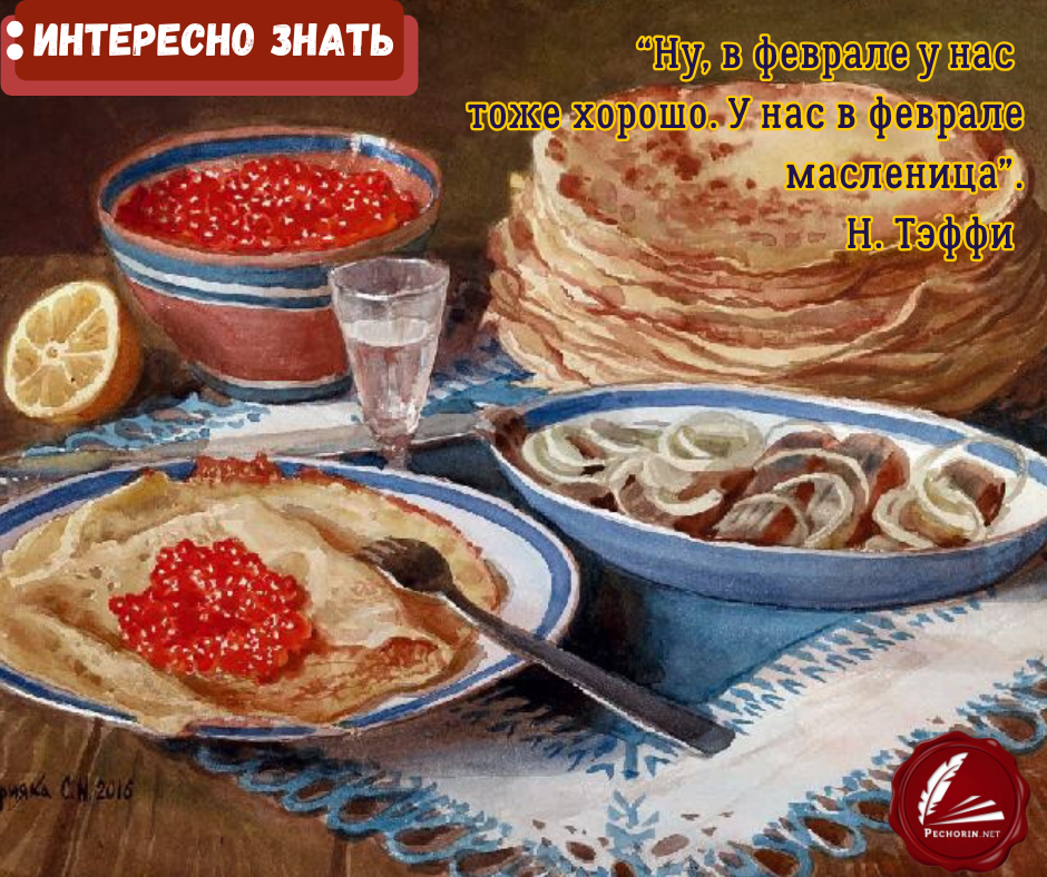В небольшой истории Н. А. Тэффи «Блины» показано, как сложно донести до иностранцев суть этого русского угощения. Иностранцы, приезжая в Россию, интересуются весной и красотой природы. На вопрос, что же такое блины, складывается комичная ситуация. Путешественники из Италии надеются понять, что же скрывается за этим лакомством, но, к сожалению, не могут уловить всю его суть.