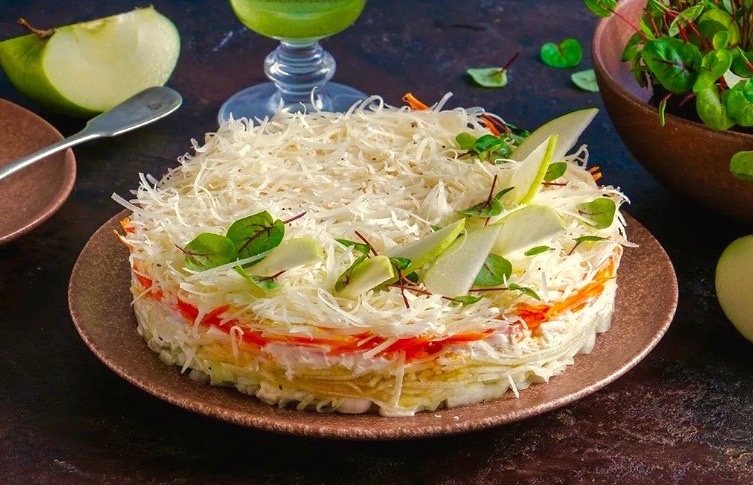 - Французский капустный салат с яблоком и яйцом — лёгкое, освежающее блюдо, в котором хрустящая капуста прекрасно сочетается с мягкими яблоками и нежными яйцами.