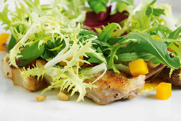 На тарелки выложите тыквенное пюре, вокруг разместите обжаренные грибы и кусочки перепелок, посыпьте кедровыми орехами (которые можно предварительно поджарить для усиления вкуса). Завершите блюдо добавлением салатной смеси, состоящей из рукколы, радиккьо, корна и фризе.