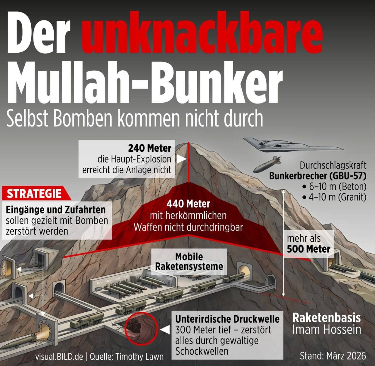 Военные эксперты постоянно обращают внимание на подземные бункеры Ирана. Например, американский эксперт Тимоти Лоун объясняет в LinkedIn, что речь идет не о обычных бункерах, против которых можно использовать противобункерное оружие. Например, "база Язд-Имам Хусейн", вырытая глубоко в граните Ширкуха, одной из самых твердых пород на Земле, является настоящей "горной крепостью", против которой даже самые тяжелые бомбы "оказались бессильны". Лоун объясняет: "Между поверхностью и подземными объектами находится "зона смерти" из 440 метров твердого гранита, в которой взрывная энергия любой бомбы полностью рассеивается", прежде чем поразить цель.