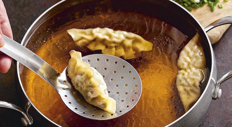Основой необычного супа стал куриный бульон, в который добавлены озорные ноты зелёного лука, чеснока, имбиря, соевого соуса и кунжутного масла. Дамплинги с начинкой из куриного мяса и овощей напоминают большие пельмени, похожие на японские гёдза или китайские димсамы. Результат — наваристый суп с насыщенным вкусом и азиатским акцентом. Такое первое блюдо идеально подойдёт как на обед, так и на ужин. Приготовление с уже готовыми пельменями — всего 20 минут, что идеально подходит как для занятых хозяек, так и для холостяков.
