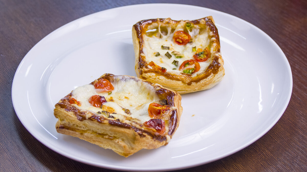 Первый этап — подготовка ингредиентов. Натрите моцареллу на крупной терке, нарежьте грибы тонкими ломтиками. У помидоров черри удалите семена, разрезав их на четвертинки, и мелко нарежьте зеленый лук. Теперь приступаем к тесту: лист слоеного теста делим на четыре равные части, из двух квадратов вырезаем бортики для создания волованов.