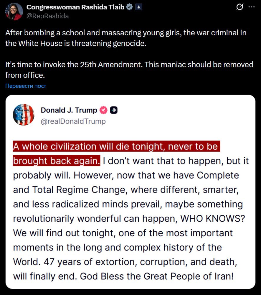 Прогрессивные демократы сегодня твердили о необходимости применить 25-ю поправку. Помимо Яссамины Ансари, за отстранение Трампа от должности выступила член Палаты представителей Рашида Тлаиб. Губернатор Калифорнии Гэвин Ньюсом также раскритиковал Трампа за угрозы уничтожить Иран.