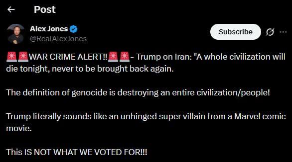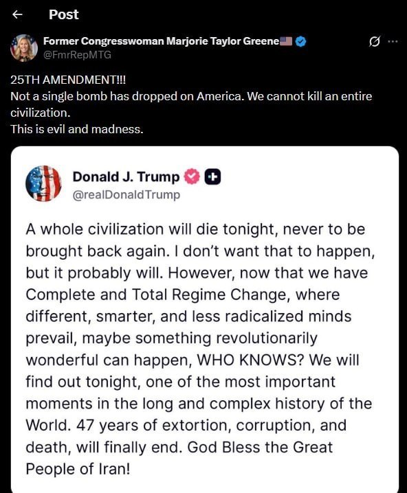Впрочем, раздражены агрессивной риторикой были и сторонники республиканской партии. Американский радиоведущий Алекс Джонс, разочаровавшийся член движения MAGA, назвал его ненормальным и способным развязать ядерную войну, добавив, что «это не то, за что мы голосовали». Марджори Тейлор Грин также призвала применить 25-ю поправку, а Такер Карлсон посоветовал немедленно забрать у Трампа ядерный чемоданчик, а высокопоставленных военных уйти в отставку.