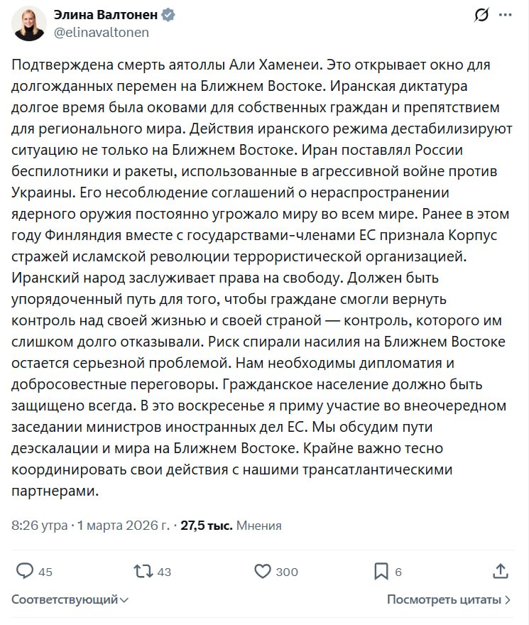 1 марта, в самом начале американо-израильской агрессии против Ирана, госпожа Валтонен также прокомментировала ситуацию, назвав убийство аятоллы Хаменеи "окном возможностей для перемен в регионе".