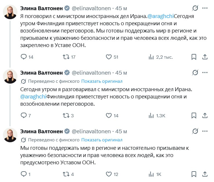Глава МИД Финляндии рассказала об утреннем разговоре с главой МИД Ирана и о том, как Хельсинки приветствует достижение перемирия на Ближнем Востоке.
