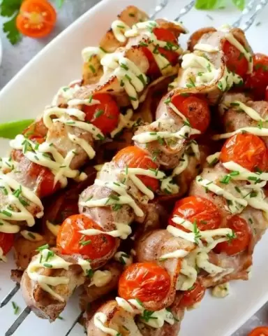 Так шашлычки держат форму и готовятся равномерно: помидор добавляет влагу, а бекон защищает курицу от прямого жара. Это похоже на сборку сэндвича: порядок ингредиентов меняет финальный вкус.