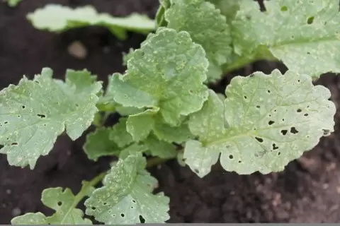 Крестоцветная блошка — это мелкое насекомое длиной всего около 3 мм, имеющее разнообразную окраску: от черного до металлически зеленого и синего. Это создание хорошо прыгает, что и привело к его названию. Активность вредителя начинается, как только температура воздуха переваливает за отметку +10°C. Первые жертвы блошек — всходы редиса, капусты, руколы и других растений, нет никаких сомнений, что они не пройдут мимо и дикорастущих видов.