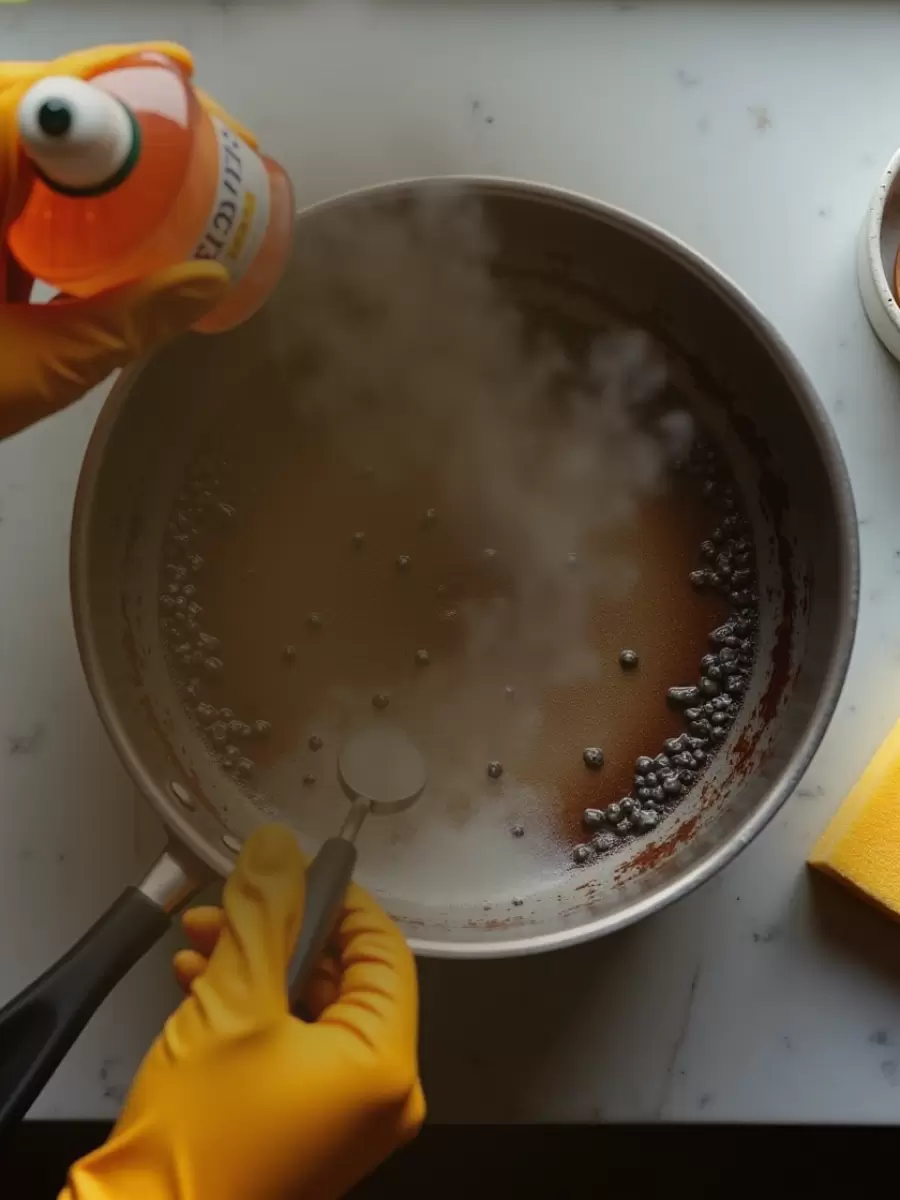 - Очистите кастрюлю: Засыпьте 2-3 столовые ложки соды и добавьте около 50 мл уксуса. Оставьте на полчаса, затем тщательно почистите губкой или щеткой с теплой водой. Альтернативно, используйте лимонную кислоту для кипячения перед чисткой.