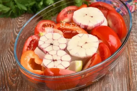 Для начала, следует подготовить основные ингредиенты. Возьмите 5 средних помидоров, 2 репчатых лука и 1 большой сладкий перец. Все овощи нарежьте крупными кусочками. Затем, разрежьте головки чеснока пополам. Расположите овощи в форме для запекания, добавьте 2-3 столовые ложки растительного масла и отправьте их в разогретую до 180 градусов духовку на 45-50 минут.