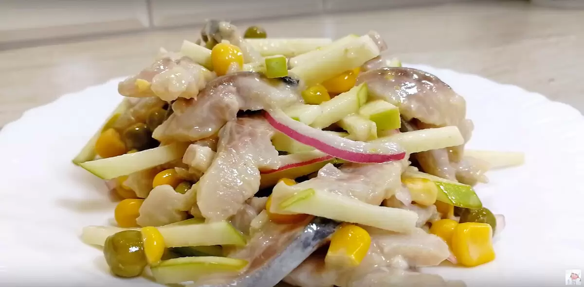 Смешайте в большой миске все ингредиенты: кукурузу, лук с яблоками и селедку. Заправьте 2 столовыми ложками майонеза и тщательно перемешайте.