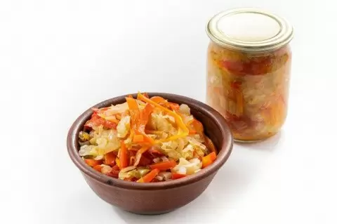Подготовьте все ингредиенты – тщательно промойте и обсушите овощи.Очистите лук и морковь. Лук нарежьте полукольцами, а морковь – соломкой, чтобы они не теряли хруст.Сладкий перец освободите от семян и плодоножки, нарежьте его брусочками для удобства.Капусту нарежьте широкой соломкой, чтобы придавать ей особую текстуру.Помидоры нарежьте на несколько частей – это поможет им лучше впитаться в общую массу.Сложите все нарезанные овощи в глубокую кастрюлю. Добавьте растительное масло, соль и сахар, чтобы сбалансировать вкус.Доведите овощи до кипения, затем уменьшите огонь и варите на медленном огне в течение 30 минут – это придаст овощам мягкость и насыщенность.Стерилизуйте банки и крышки на пару в течение 15-20 минут, чтобы сохранить все витамины.Переложите готовые овощи в стерилизованные банки, закройте их крышками и укутайте одеялом до полного остывания.Храните готовый салат в тёмном и прохладном месте для долгого сохранения.Такой салат станет настоящей находкой в зимние дни, когда хочется вернуться к воспоминаниям о лете. Угощайте своих близких, демонстрируя, что летние вкусы могут жить даже в холодное время года!