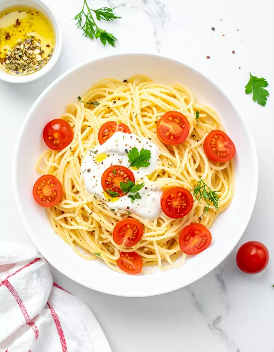 Приготовление выполняется в несколько простых шагов: отварить макароны до состояния «аль денте», нарезать помидоры пополам, смешать йогурт с лимонным соком, солью и перцем. В конце добавить горячие макароны, черри и зелень — и блюдо готово!