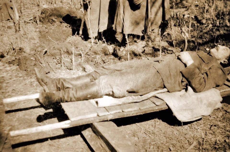 Тело генерал-лейтенанта Михаила Григорьевича Ефремова (1897-1942), застрелившегося, чтобы не попасть в немецкий плен.