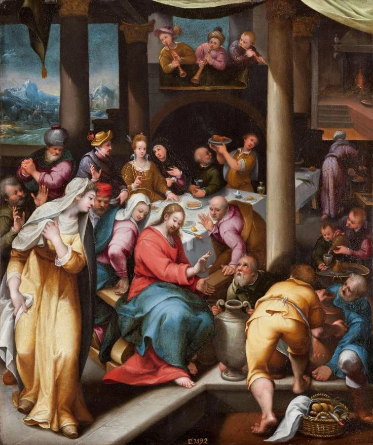 Христос послушал Божью Матерь и превращает 600 литров воды, которой должны были помыть руки и ноги, в самое лучшее в мире вино, такое, которого никогда не пробовал человек.