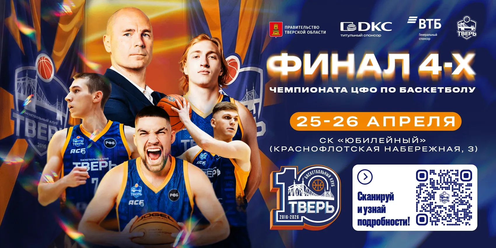 25-26 апреля Дворец спорта «Юбилейный» в Твери станет площадкой «Финала четырех» Чемпионата ЦФО по баскетболу среди мужских команд - самого масштабного соревнования в истории турнира