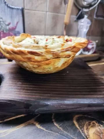 Одновременно раскатайте тесто на две равные части толщиной в 0,6-0,7 мм. С помощью чаши большего диаметра вырежьте круги и выложите их в посуду для запекания, обтягивая стенки. Используя остатки теста, можно создать узор на верхней части блюда, придавая ему красивый вид. Разбейте яйцо и смажьте им верхнюю часть.