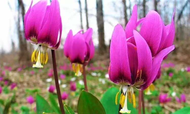 Эритрониум известен как луковичный первоцвет. Кандык сибирский радует глаз своими цветами, часто появляющимися даже под снегом, в то время как европейский сорт цветет позже. В зависимости от вида, этот цветок может быть желтым, розовым, белым или сиреневым, напоминая миниатюрные лилии.