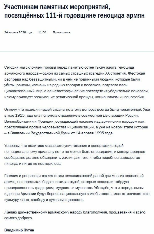 "Мы склоняем головы перед памятью сотен тысяч жертв": Путин направил послание по случаю 111-летия Геноцида армян.
